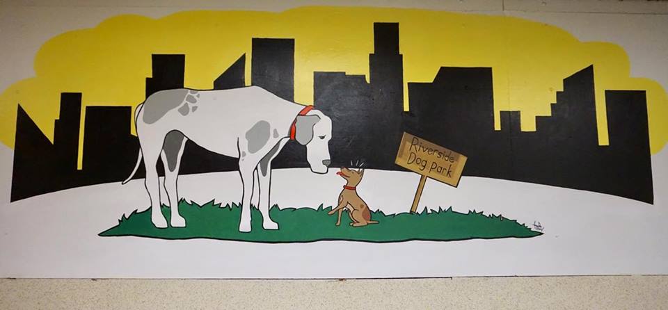 You can see her murals today. She has painted murals (one of them spanning 16 feet long!) in the Fetch Room, the Tiny and Small Dog Room and the vestibule outside out front door. Currently, she is working on murals in the Grooming Room, the Cat Room, and – who knows – maybe a few more places.